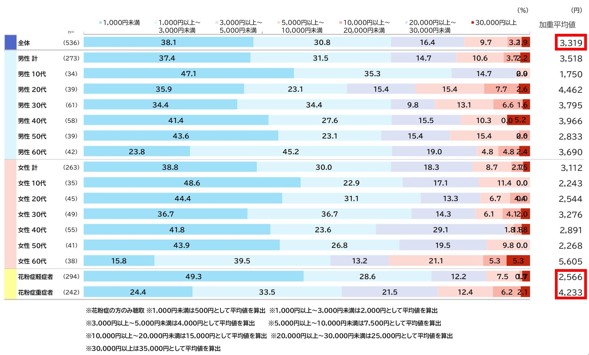 花粉症対策にかける費用は、全体の約7割が「3,000円未満」に集中しており、平均では3,319円となりました。男女別で大きな違いは見られない一方で、花粉症の症状別に見ると、「花粉症軽症者」は1,000円未満が半数程度なのに対し、「花粉症重症者」では24.4%に留まり、3,000円以上の割合は約2倍となっています。「花粉症重症者」の方が対策にお金をかけている傾向にあることが伺えます。