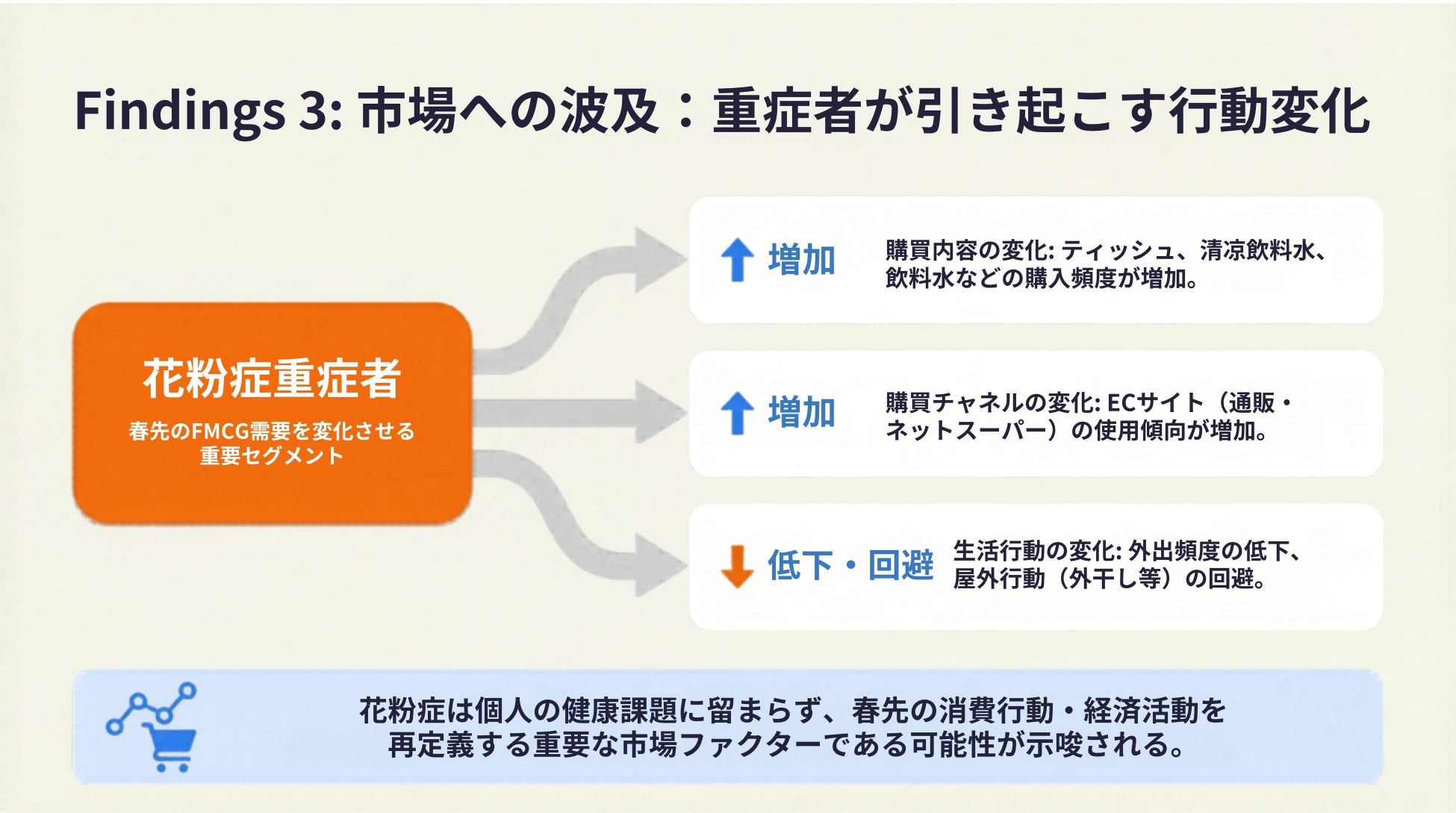 「花粉症重症者」は春先にティッシュ、清涼飲料水、飲料水などを中心に飲料・日用品など複数のFMCGカテゴリで購入頻度が増加傾向である。「花粉症重症者」はECサイトの使用頻度が増加する傾向にあり、花粉症の症状が購買チャネルや購買内容に影響を与えている可能性が示唆される。「花粉症重症者」は春先に、外出頻度の低下や屋外行動の回避といった生活行動の変化がみられる。