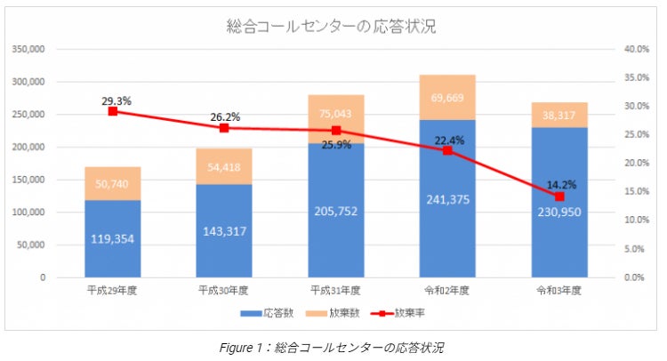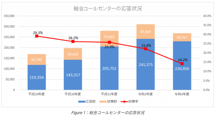 神戸市役所では、ホームページによる情報発信に力を入れており、年間アクセス数は1.2億回にのぼります。市民向けの情報はあまねく公式ホームページに掲載されているにもかかわらず、情報量が多いため、それぞれの利用者が欲しい情報を探しきれずに電話で問い合わせる場合も多く、問い合わせの効率化が課題となっていました。特にコロナ禍以降、ワクチン接種等に関する問合せなど、問合せ電話量は増加しており、2021年度(平成31年度)には年間約27万件/年にまで増加し、電話応答率は約86%で、約14%の電話は対応しきれずに放棄されていました。