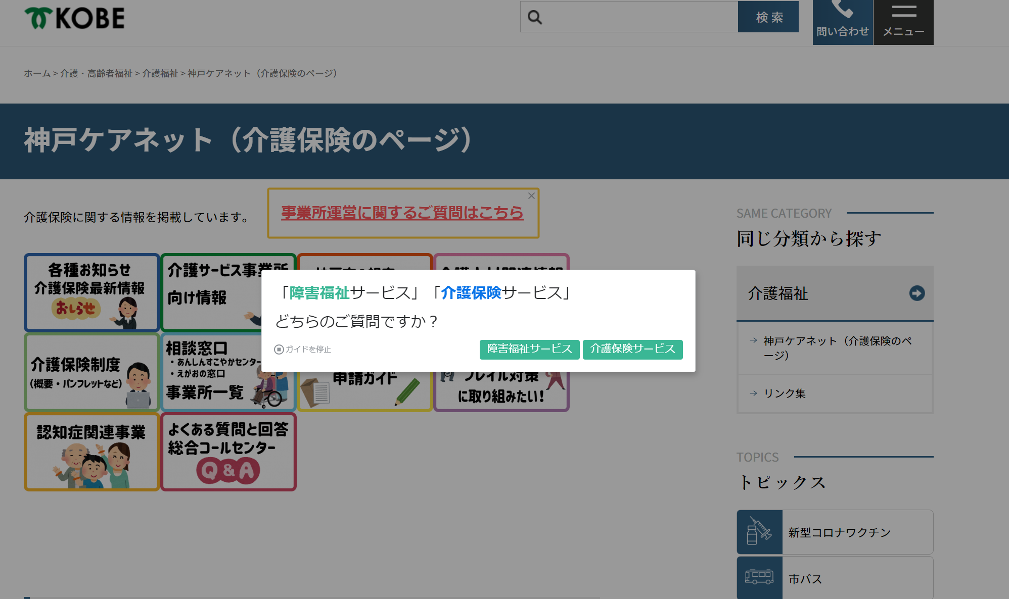 問合せ電話の削減のための対応策として、FAQページの実装や、AIチャットボットの導入などで、一定数の問合せ件数を減らすことには成功しました。ただし、課題は依然として残っており、市民がホームページにおいて知りたい情報を取得する際に、目的の情報にたどりつくことをサポートするプロジェクトを、2022年、同市が運営する、地域・行政課題の解決を目的としたプロジェクト(Urban Innovation KOBE)内で立ち上げ、そのプロジェクトの実施主体の企業としてテックタッチを採用し、「テックタッチ」による試行導入、実証実験を、2022年12月~2023年2月の3ヶ月間実施しました(※)。