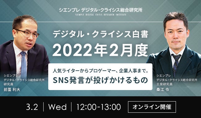 「デジタル・クライシス白書-2022年2月度-人気ライターからプロゲーマー、企業人事まで。SNS発言が投げかけるもの」セミナー実施のお知らせ