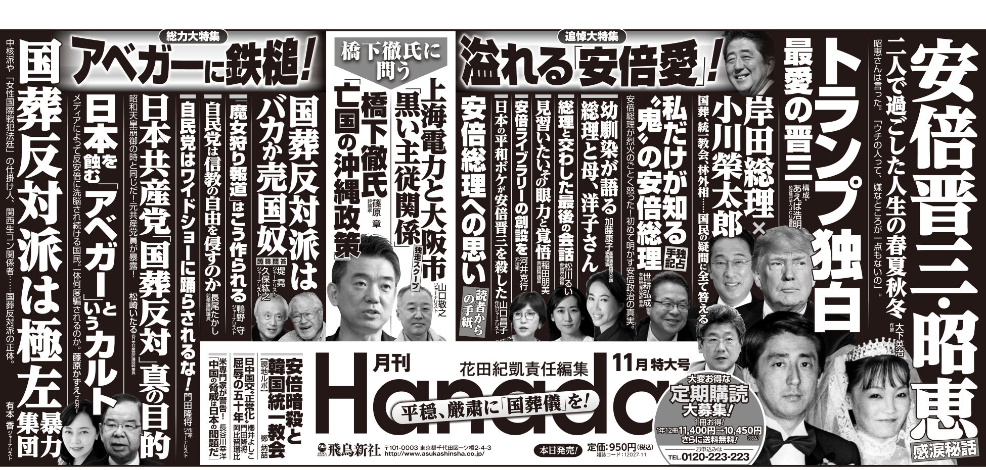 岸田文雄総理が9月26日(月)発売の月刊『Hanada』11月号の単独インタビューに応じ(聞き手・小川榮太郎氏)、国葬儀、旧統一教会、林芳正外相への不安、増税など、国民の疑問と不安に全て答えた。