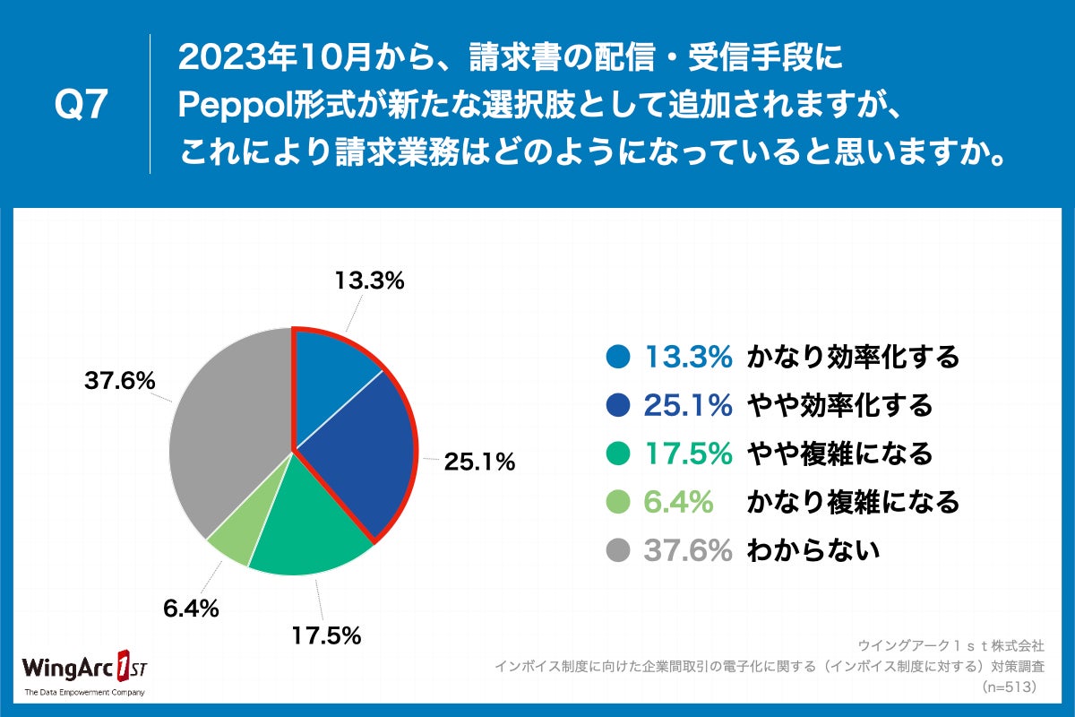 「Q7.2023年10月から、貴社の企業間で取引される請求書の配信・受信手段にPeppol形式が新たな選択肢として追加されますが、これにより請求業務はどのようになっていると思いますか。」(n=513)と質問したところ、「かなり効率化する」が13.3%、「やや効率化する」が25.1%という回答となりました。