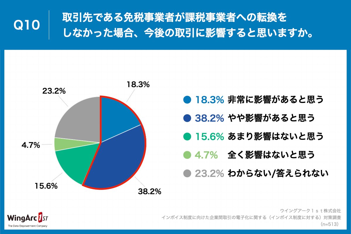 「Q10.取引先である免税事業者が課税事業者への転換をしなかった場合、今後の取引に影響すると思いますか。」(n=513)と質問したところ、「非常に影響があると思う」が18.3%、「やや影響があると思う」が38.2%という回答となりました。