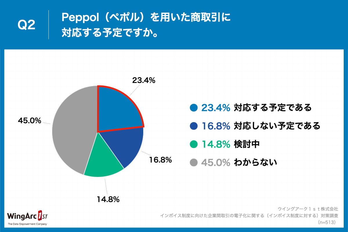「Q2.Peppol(ペポル)を用いた商取引に対応する予定ですか。」(n=513)と質問したところ、「対応する予定である」が23.4%となった一方、「対応しない予定である」が16.8%という回答となり前回調査時の7.8%から2倍以上増加しています。