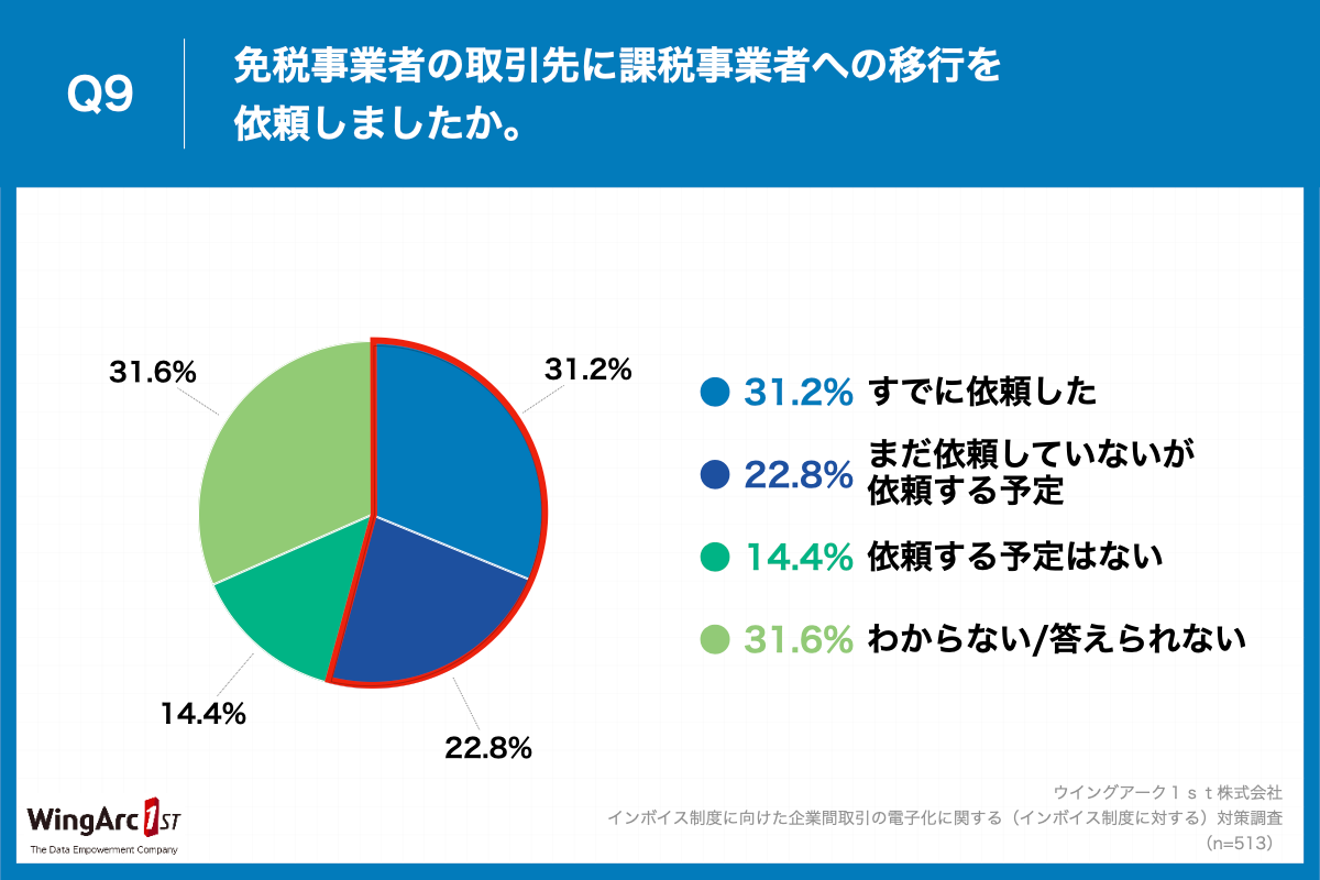 「Q9.免税事業者の取引先に課税事業者への移行を依頼しましたか。」(n=513)と質問したところ、「すでに依頼した」が31.2%、「まだ依頼していないが依頼する予定」が22.8%という回答となりました。
