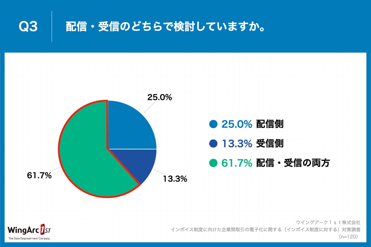 Q2で「対応する予定である」と回答した方に、「Q3.配信・受信のどちらで検討していますか。」(n=120)と質問したところ、「配信側」が25.0%、「配信・受信の両方」が61.7%という回答となりました。