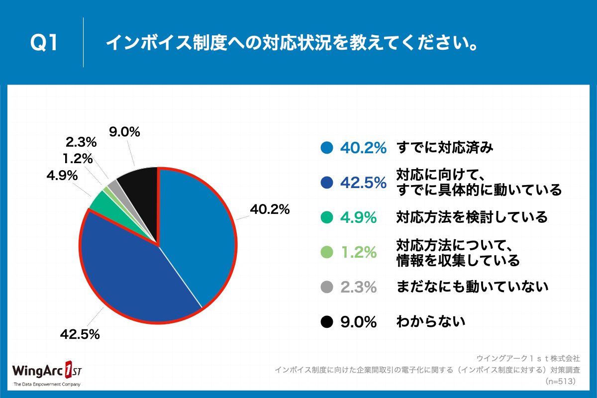 「Q1.インボイス制度への対応状況を教えてください。」(n=513)と質問したところ、「すでに対応済み」が40.2%、「対応に向けて、すでに具体的に動いている」が42.5%という回答となりました。