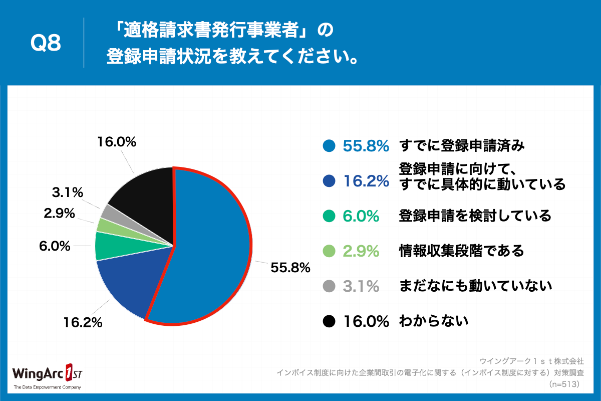 「Q8.「適格請求書発行事業者」の登録申請状況を教えてください。」(n=513)と質問したところ、「すでに登録申請済み」が55.8%、「登録申請に向けて、すでに具体的に動いている」が16.2%という回答となりました。