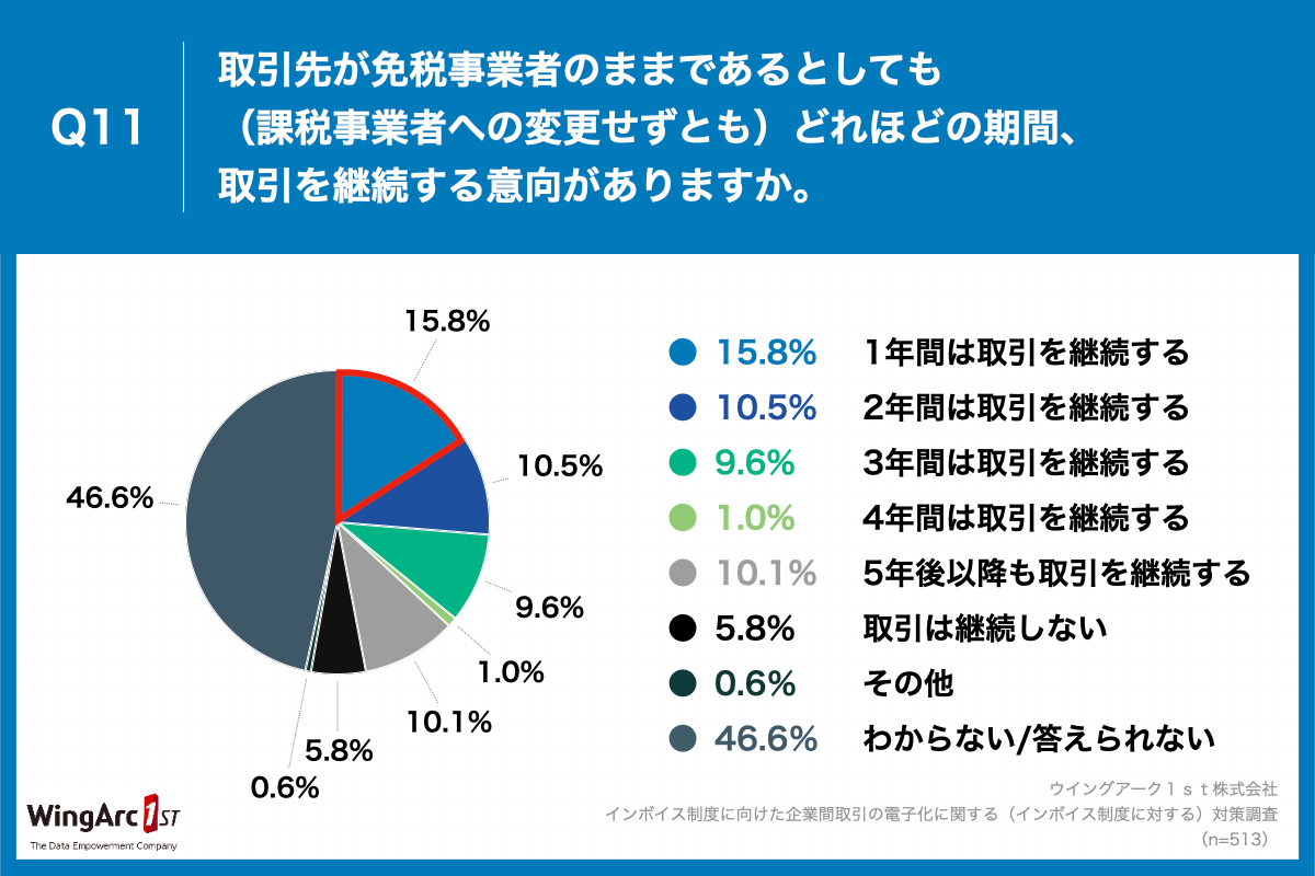 「Q11.取引先が免税事業者のままであるとしても(課税事業者への変更せずとも)どれほどの期間、取引を継続する意向がありますか。」(n=513)と質問したところ、「1年間は取引を継続する」が15.8%、「2年間は取引を継続する」が10.5%という回答となりました。