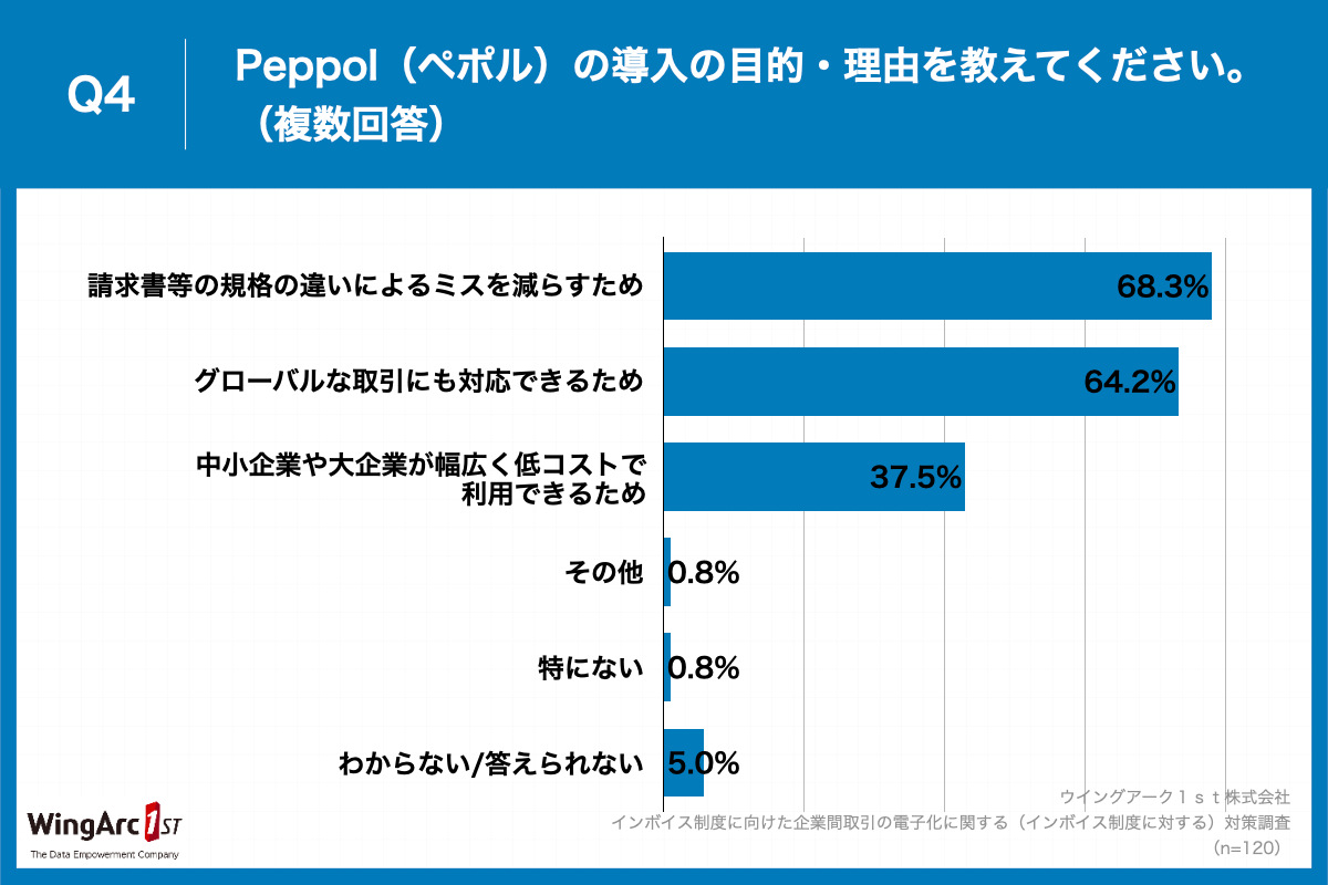 Q2で「対応する予定である」と回答した方に、「Q4.Peppol(ペポル)の導入の目的・理由を教えてください。(複数回答)」(n=120)と質問したところ、「請求書等の規格の違いによるミスを減らすため」が68.3%、「グローバルな取引にも対応できるため」が64.2%、「中小企業や大企業が幅広く低コストで利用できるため」が37.5%という回答となりました。