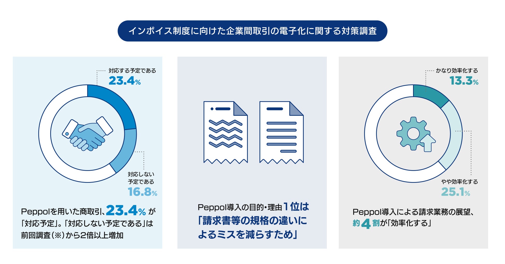 ・Peppol(ペポル)を用いた商取引、23.4%が「対応予定」。「対応しない予定である」は前回調査(※)から2倍以上増加。