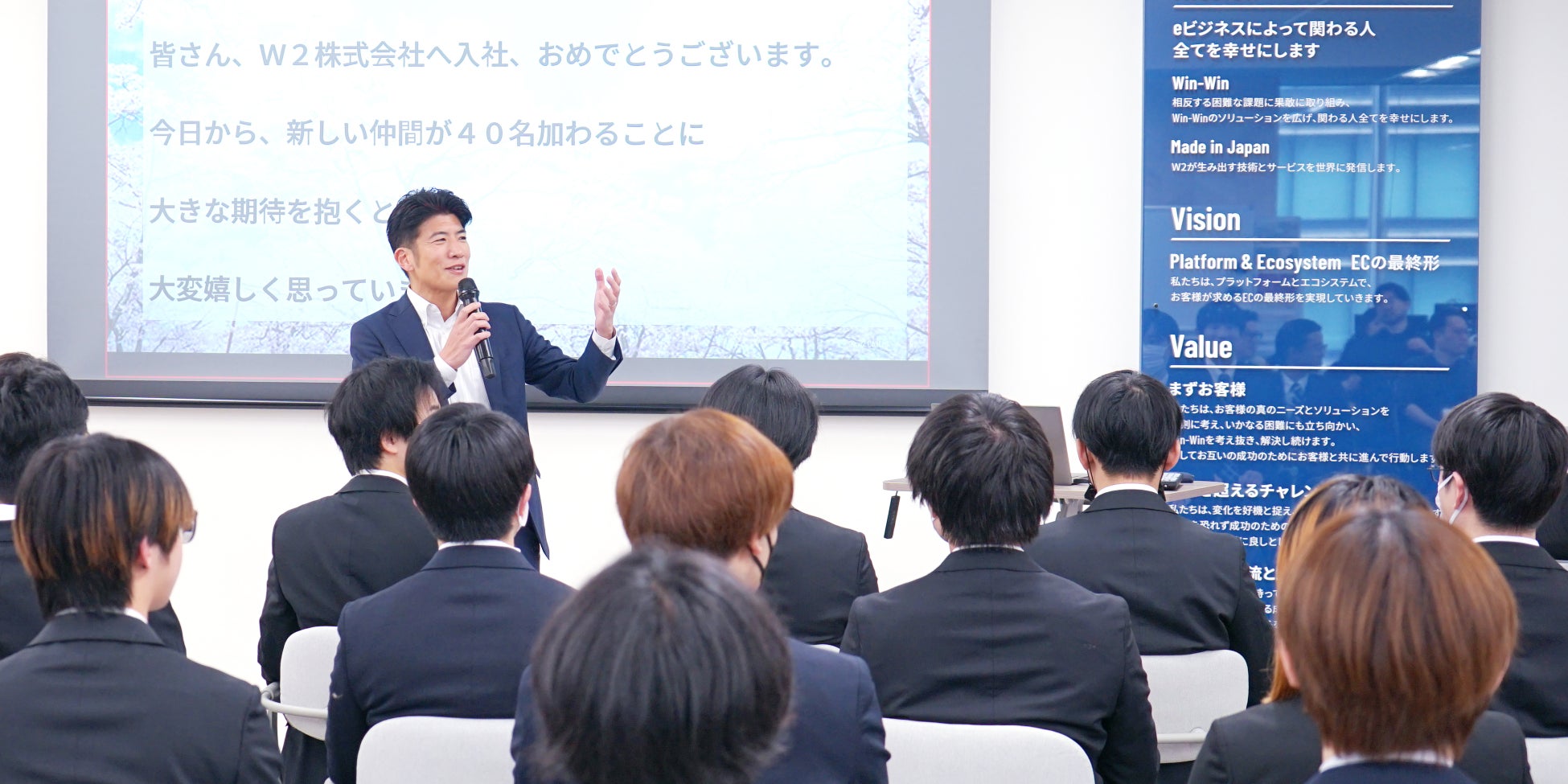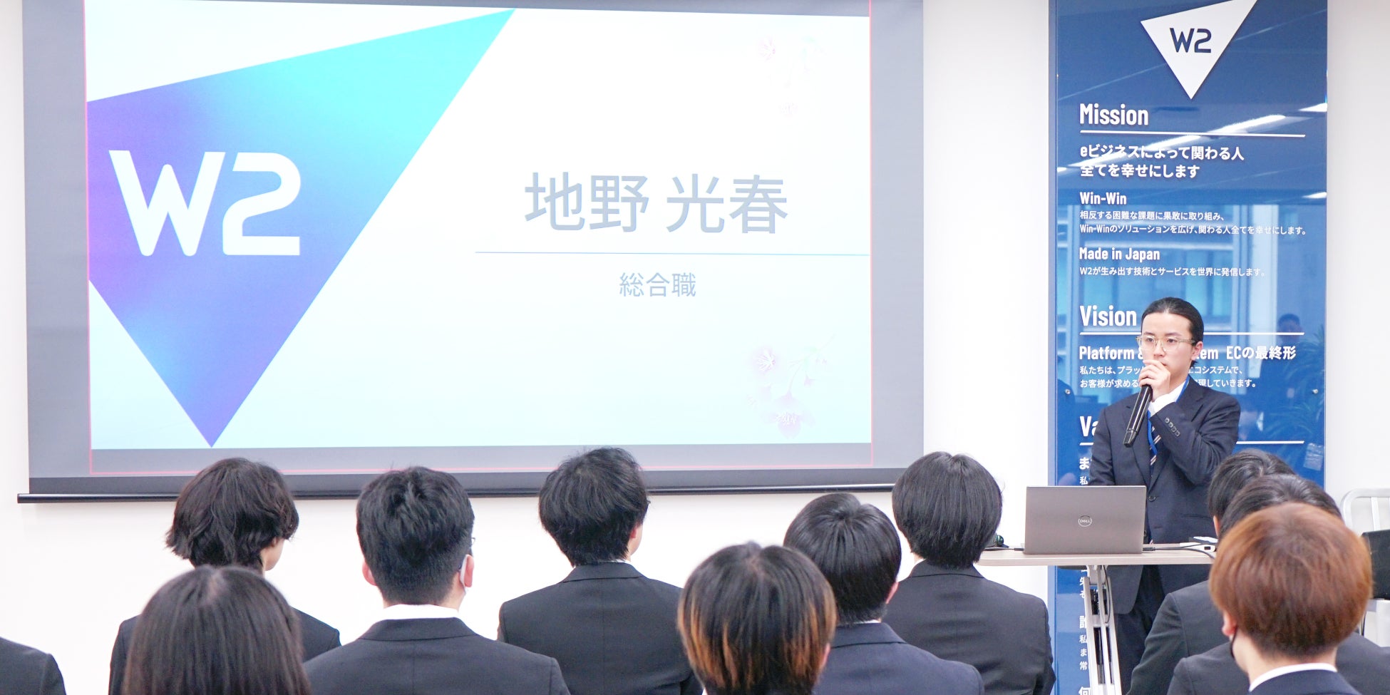 新入社員の皆さん、W2へのご入社おめでとうございます。W2では、「コマースを前へ、生活を前へ、世界を前へ」をステートメントとして掲げ、EC業界において、次の時代を切り拓く製品・サービスを開発し提供しています。