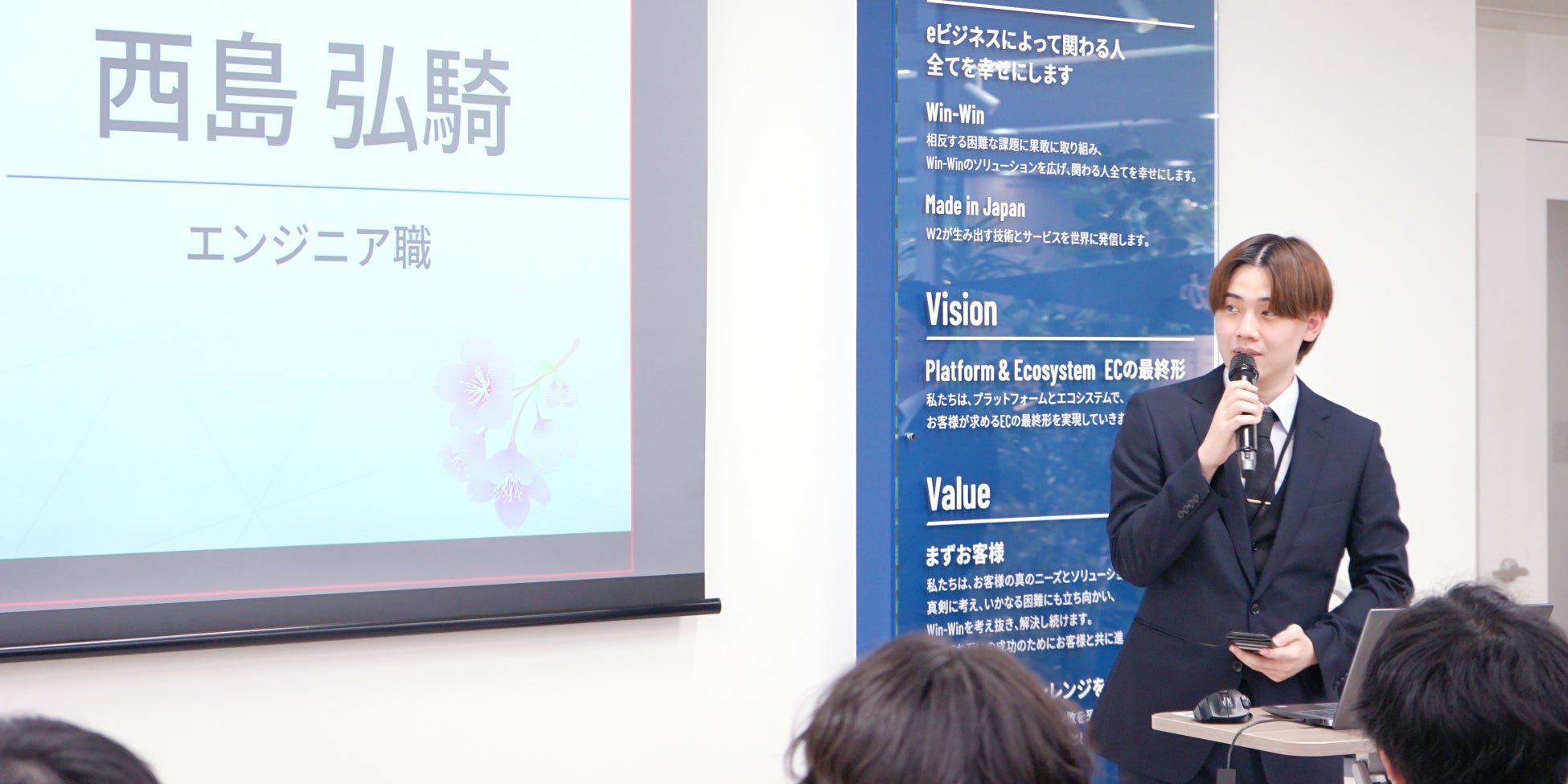 本日は新入社員代表としてご挨拶の機会をいただき、ありがとうございます。W2のMission・Vision・Valueに共感し、成長する意欲を持ってこの場に立っています。
