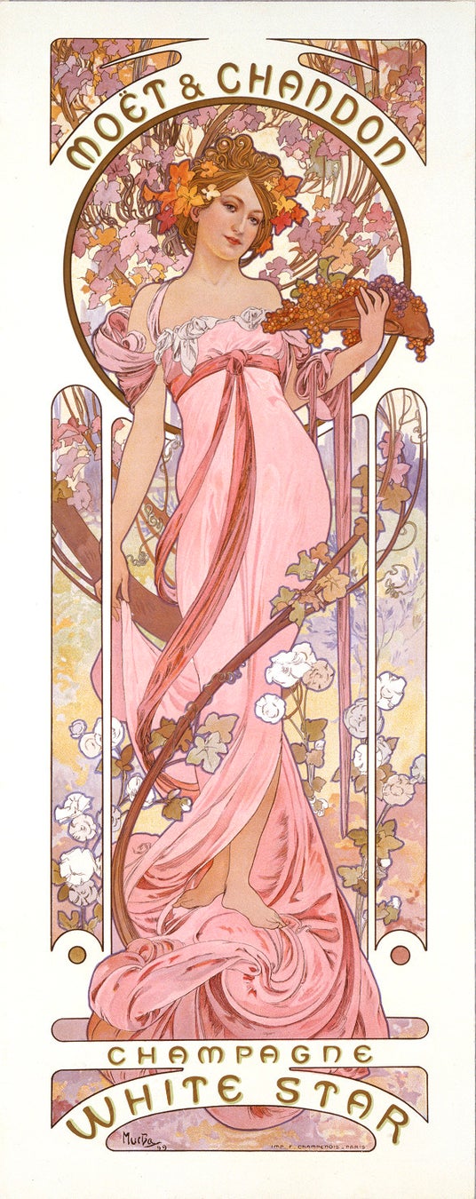 その中でも、シャンパーニュで著名なモエ・エ・シャンドン社の広告デザインは有名です。その優美な花と女性のモチーフからバーテンダーがモエ・エ・シャンドンとピーチやアプリコットを使用したフェスティブシーズンにぴったりのほんのり甘い大人のシャンパンカクテルをご用意しました。