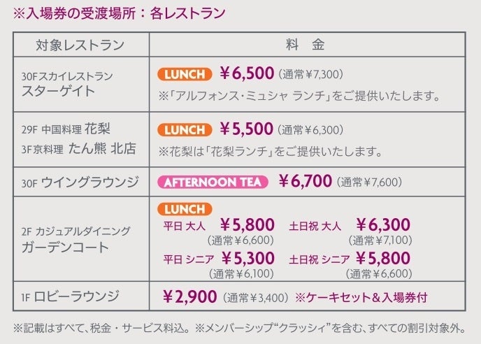 コラボレーションコースのスターゲイトはもちろん、中国料理、ブッフェ、ラウンジのほかアフタヌーンティーセットと入場券をセットにしたお得なプランをご用意しました。