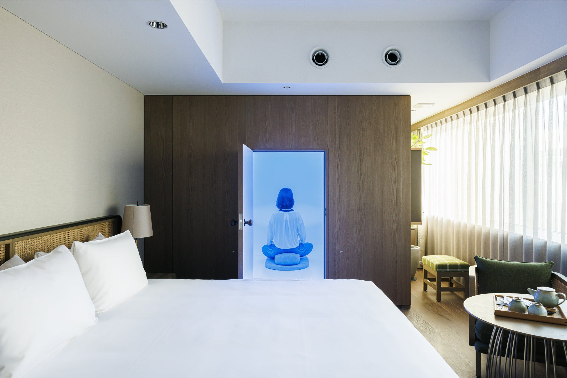 「瞑想(MU) ROOM」は、日々のストレスや心の疲れを「瞑想」を通じてリセットする、まったく新しいコンセプトルーム。人間の様々な感覚を刺激し、最適なマインドフルネスアクティビティを提供するPanasonic社製の瞑想空間「(MU)ROOM(ムルーム)」を客室内に設置。自然の揺らぎを再現するミスト、光、音、香りを制御した“無”の空間が、初心者でも簡単に瞑想へと誘います。マインドフルネスに役立つ厳選した書籍やレコードを取り揃えたリラックス空間で、日々の疲れを癒し、自己と向き合う、まったく新しいステイ体験をお楽しみください。