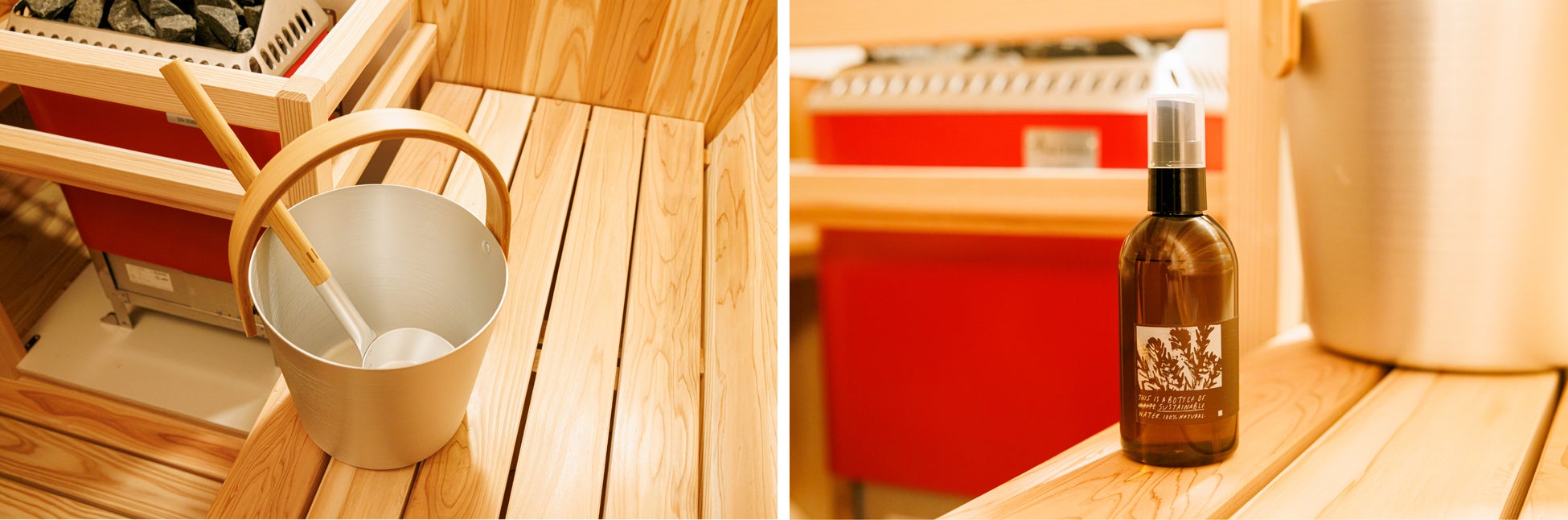 サウナストーンにお好みで楽しめるアロマ水は、京都市右京区京北の「杉乃精」から取り寄せた「サステナブルウォーター」を使用。精油を作る際に、蒸留釜で精油と一緒に精製されている水の部分は、約30ml~200mlの精油に対し8ℓも、精製されます。そのほとんどが廃棄されている現状を受け「サステナブルウォーター」として通常は当施設内のイベント時にプレゼントしています。水溶性の香りの成分と少量の精油成分を含むので自然の香りを感じられ、よりリラックスした空間に包まれます。