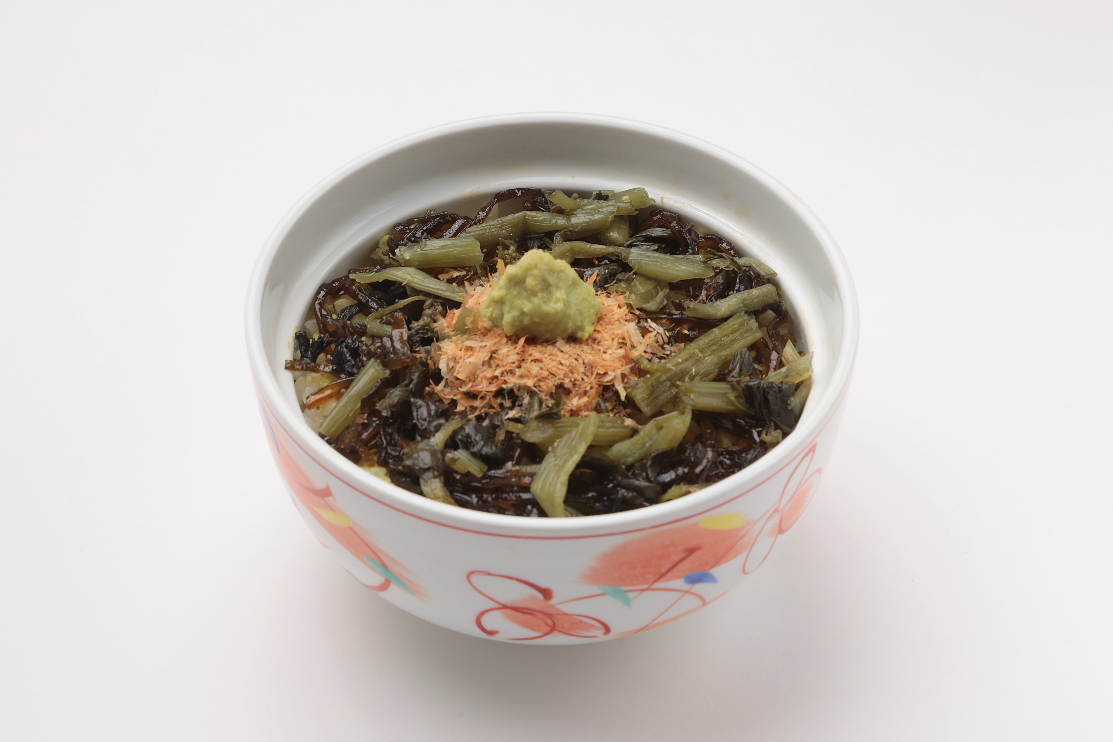 「藤崎わさび園」の本わさび、わさびの茎漬け、わさび昆布をのせたわさび三昧の小丼。1週目同様にイートイン「麺 風來堂」でも注文可能です。