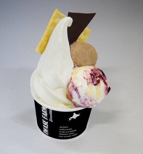 ソフトクリームと自家製ジェラートが一度に楽しめるジェラソフト。ハスカップソースとはちみつを合わせたハニーハスカップジェラートは当社限定です。※ジェラートはお好きな2種類が選べます。