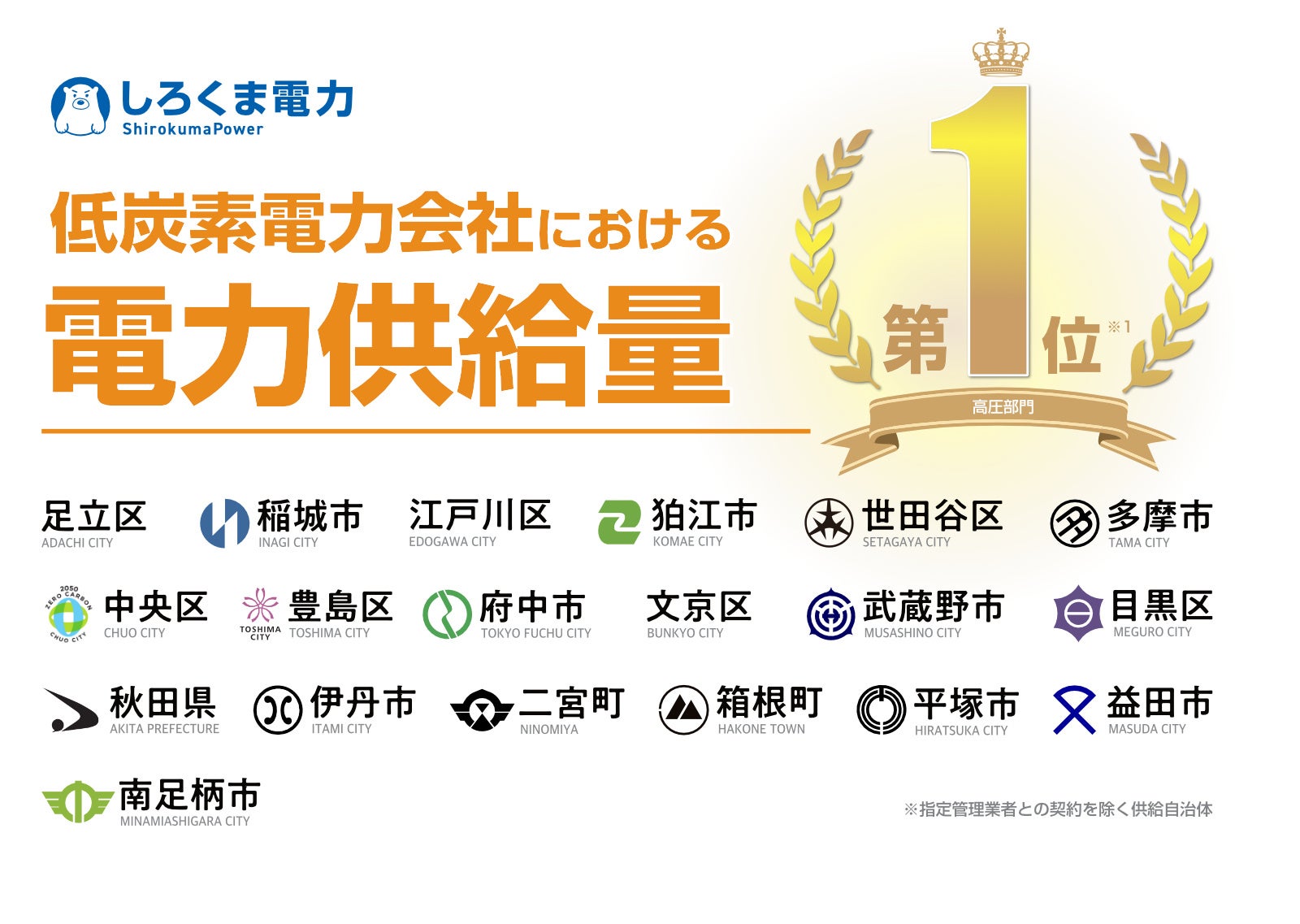 グリーンに特化した電力会社のしろくま電力株式会社(東京都港区、代表取締役 谷本 貫造、以下、しろくま電力)は、政府が掲げる『2030年の電力部門の排出係数目標を満たす電力会社』において、電力供給量第1位*1を獲得しました。2025年3月末時点での供給量は前年比200%(約500MW)*2と、法人を中心に多くの支持を集めています。また、自治体の電力入札においても、4月1日より新たに秋田県や東京都多摩市、稲城市などを含む21自治体に電力供給を開始し、東京都内7区、全国25自治体へ供給しています。