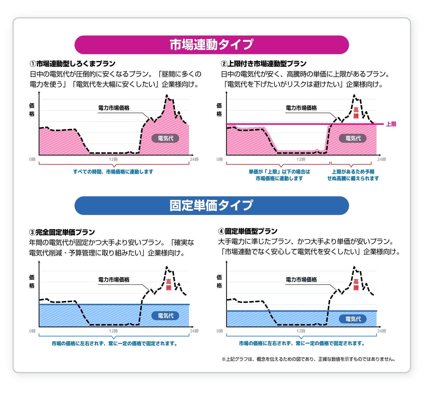 しろくま電力は、「市場連動型しろくまプラン」や「上限付き市場連動型プラン」、「固定単価型プラン」「完全固定型プラン」などを展開しており、電力ニーズに即したプラン選択が可能です。電気代の値上げが相次ぐ中、『コスト削減が最重要課題』や『コスト削減と電気代の変動リスク管理を両立したい』といった需要家の様々なニーズに合わせてプランを提案しています。すべてのプランで電気代削減と脱炭素が両立可能です。
