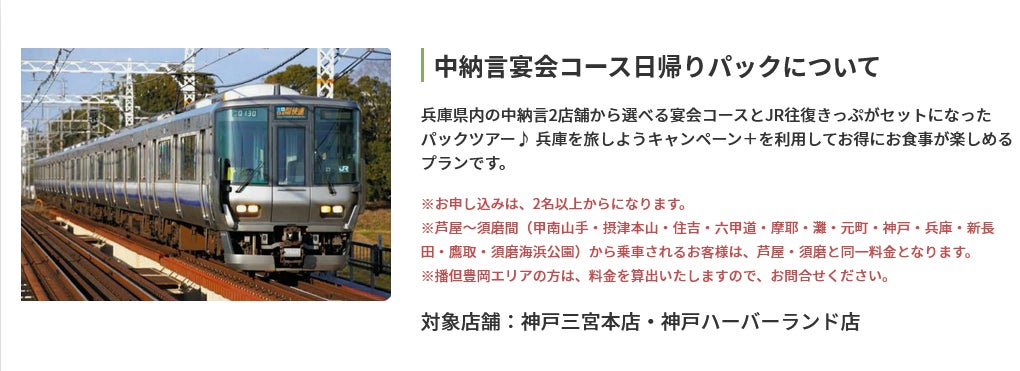 兵庫県内の中納言2店舗から選べる宴会コースとJR往復きっぷがセットになったパックツアー♪ 兵庫を旅しようキャンペーン+を利用してお得にお食事が楽しめるプランです。