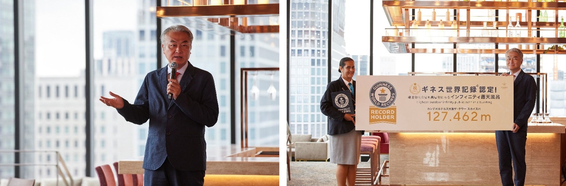認定式では、ギネス世界記録認定員 後河内ソニア様から世界最大級の高さ地上127.462mにある「インフィニティ露天風呂」は、「建造物内の最も高層階にあるインフィニティ露天風呂/ Highest outdoor infinity public bath in a building」として、ギネス世界記録認定されました。