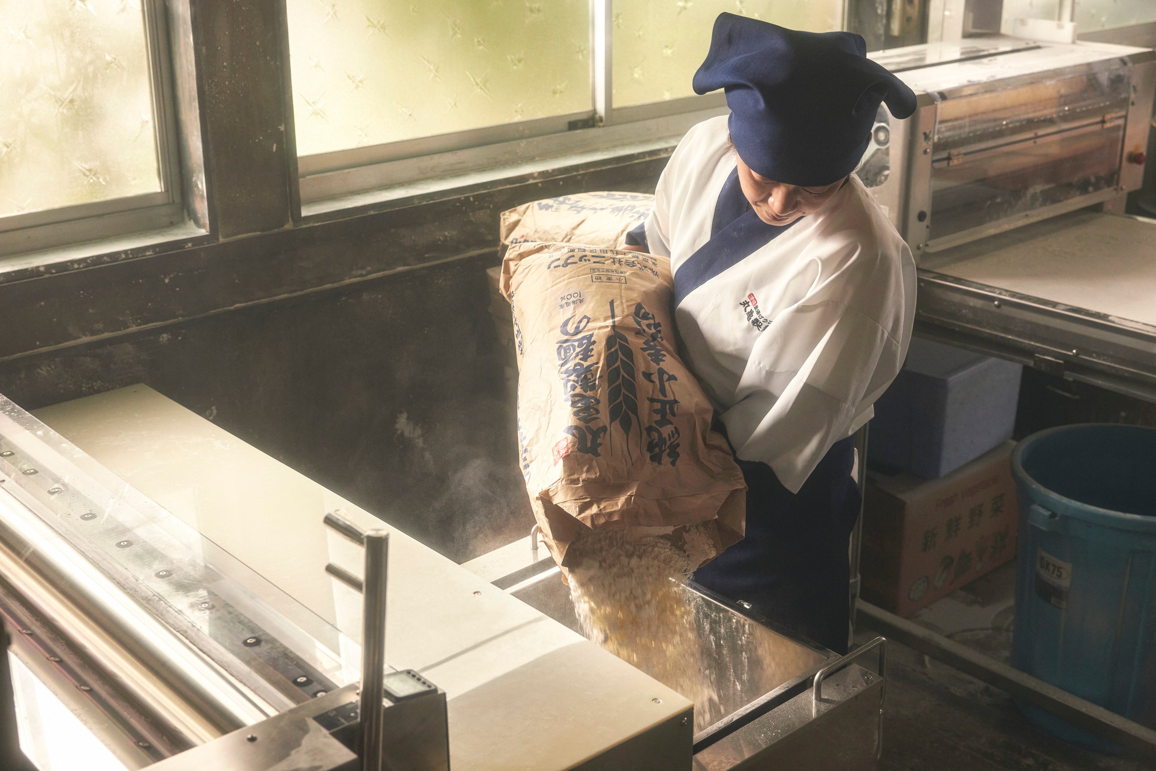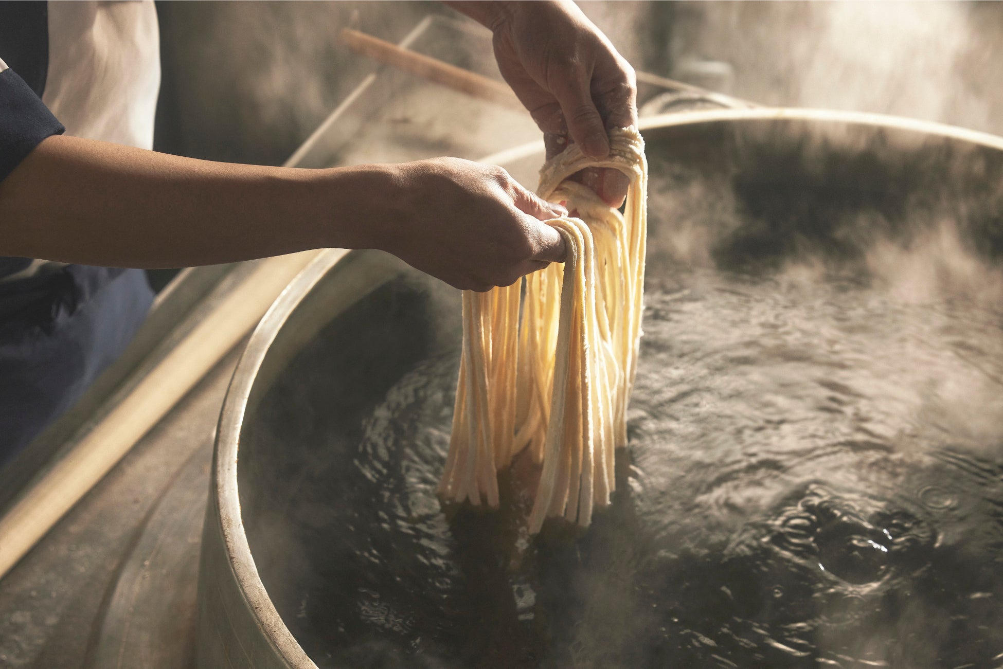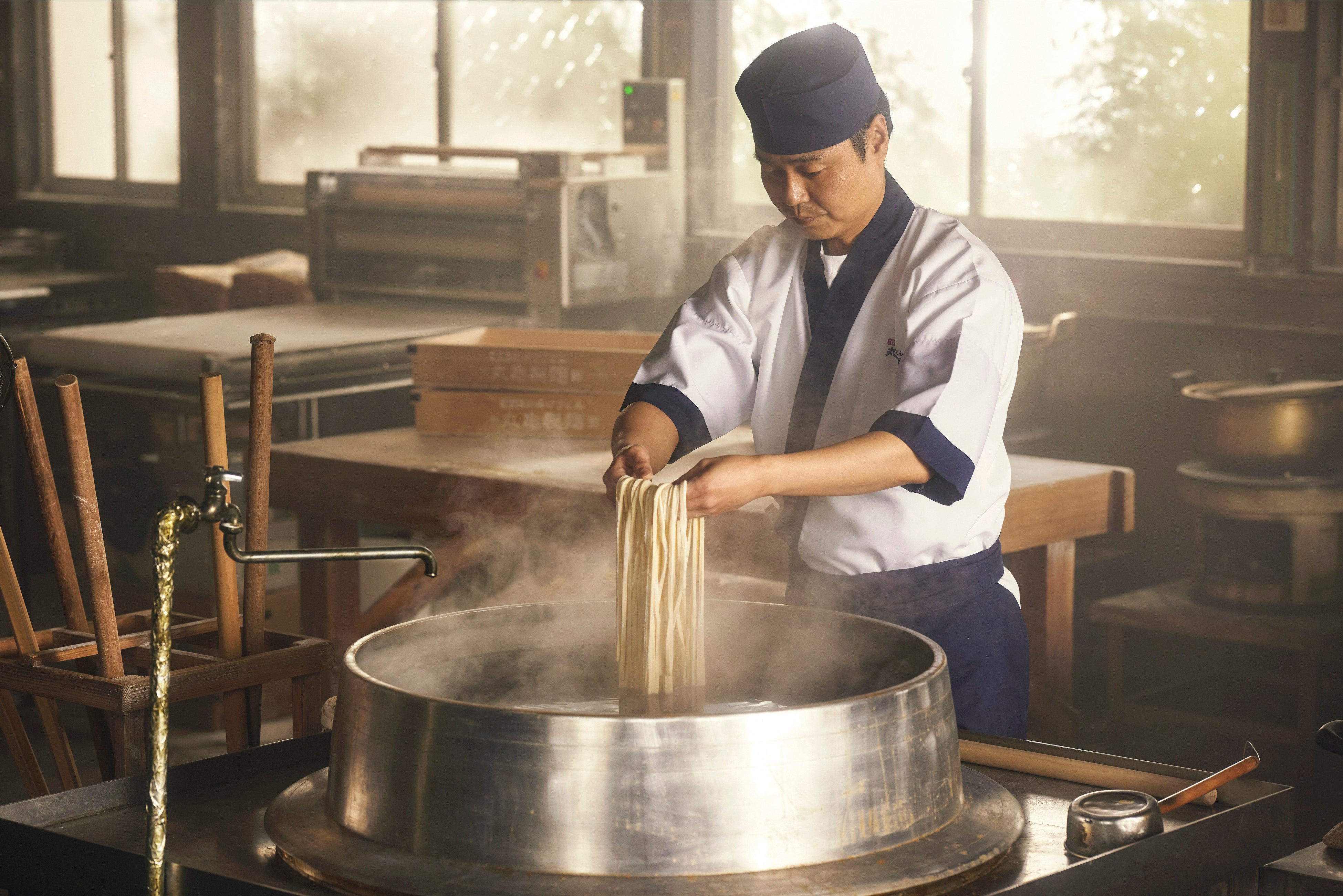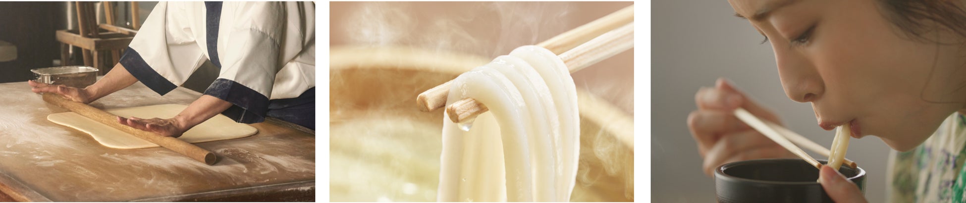 さらに、厳しい試験を合格した麺職人たちは、安定したおいしさ以上の「最高の一杯」をお届けするために、日々腕と感性を磨きながら粉からうどん打ち、手づくり・できたてのうどんを提供しています。