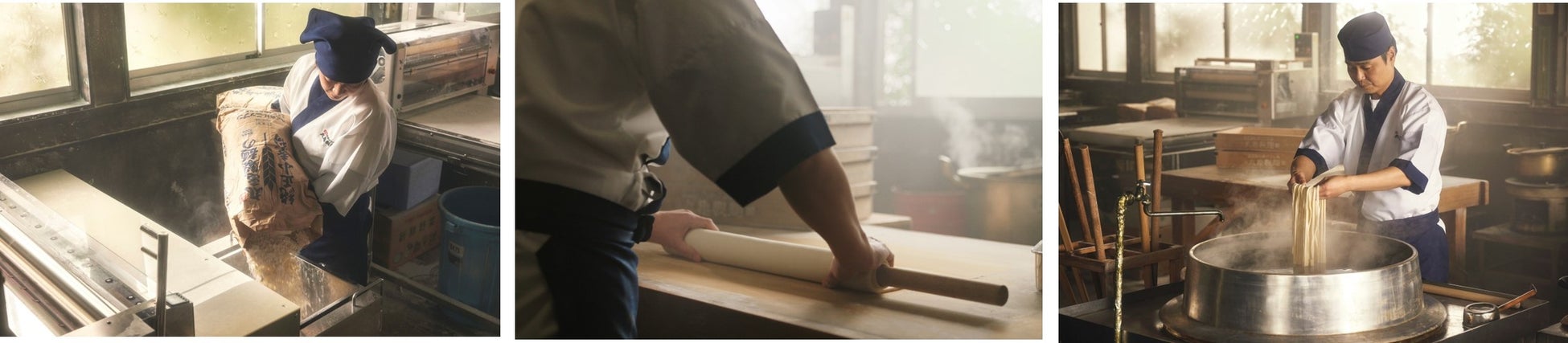 「丸亀製麺は“一軒一軒が、製麺所。”」というナレーションの通り、800を超えるすべての店で毎朝100%の国産小麦からうどんをつくっています。そんな製麺所には、「打ち立て・生」の本当のうどんのおいしさを伝えるべく、日々腕と感性を研ぎ澄ましている”麺職人たち”が、真剣な眼差しでうどんを打ち、お客さまをお迎えしております。