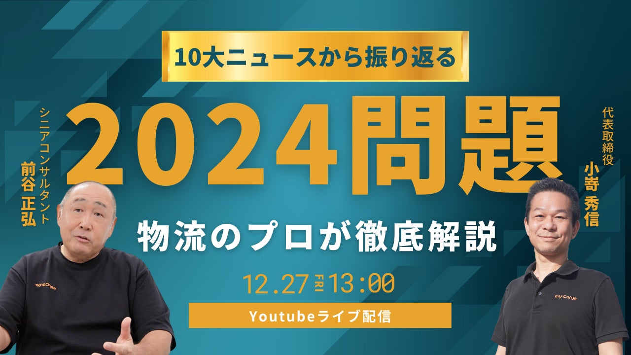 ラストマイル物流に特化した物流ソリューション事業を展開する株式会社エニキャリ(以下エニキャリ)は、「10大ニュースから振り返る2024問題-物流のプロが徹底解説-」と題して、12月27日(金)13時より、YouTubeでライブ配信を行うことをお知らせします。