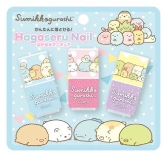新商品は、すみっコぐらしのイラストがプリントされたキッズコスメシリーズ。気分によってカラーを選べる「はがせるマニキュア3本セット」やほんのり色づく「色つきリップクリーム」のほか、ラバーマスコットとモコモコチャームがかわいい「チャーム付きリップ&ハンドクリーム」など全5アイテムのラインアップとなっています。