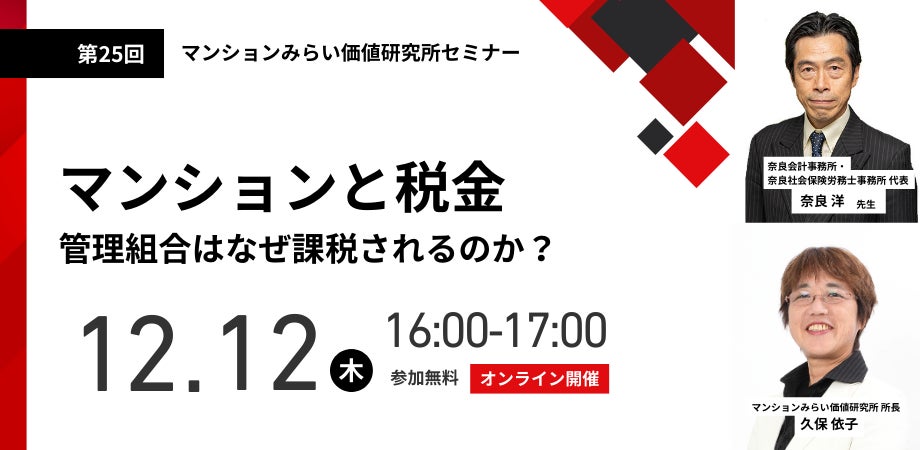 『マンションと税金 管理組合はなぜ課税されるのか?』12月12日(木)無料WEBセミナー(マンションみらい価値研究所主催)