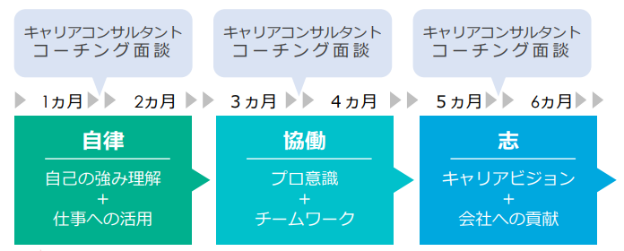 6か月の間で、自らの強みを活かして仕事を進め、スキルを高める「自律」、成果に責任を持って周囲を巻き込み、より大きな仕事の成果・変化を生み出す「協働」、未来への貢献を考え、会社とともに成長を描けるようになる「志」の3ステップに分けて研修を実施することで、個人から周囲・現在から未来へと影響範囲を広げていく研修となっています。