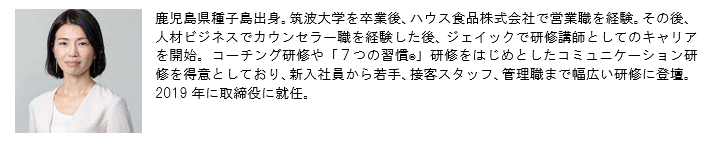 鹿児島県種子島出身。筑波大学を卒業後、ハウス食品株式会社で営業職を経験。その後、人材ビジネスでカウンセラー職を経験した後、ジェイックで研修講師としてのキャリアを開始。コーチング研修や「7つの習慣®」研修をはじめとしたコミュニケーション研修を得意としており、新入社員から若手、接客スタッフ、管理職まで幅広い研修に登壇。2019年に取締役に就任。