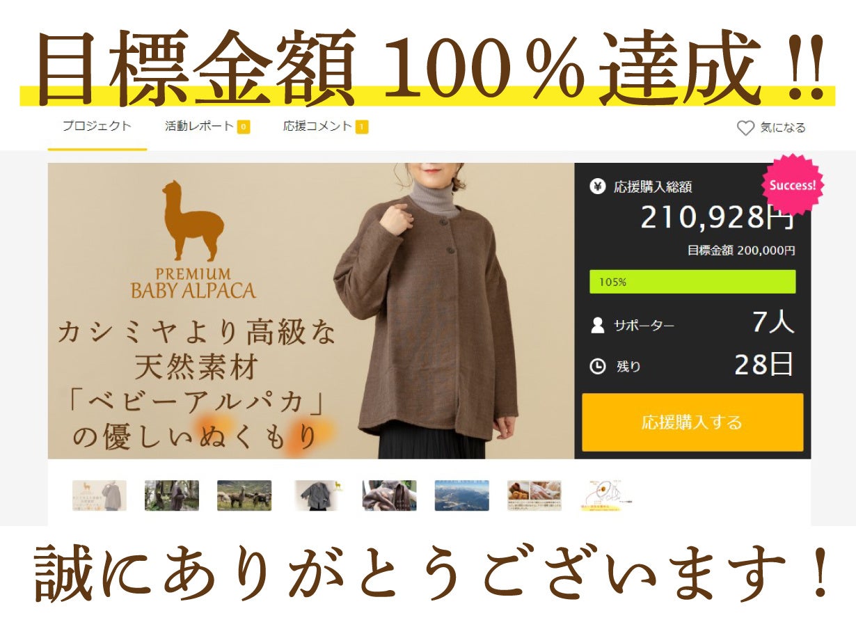 8月17日(水)よりスタート致しました。アルパカカーディガンが、公開翌日で早くも目標金額達成!沢山のご支援・応援ありがとうございました!