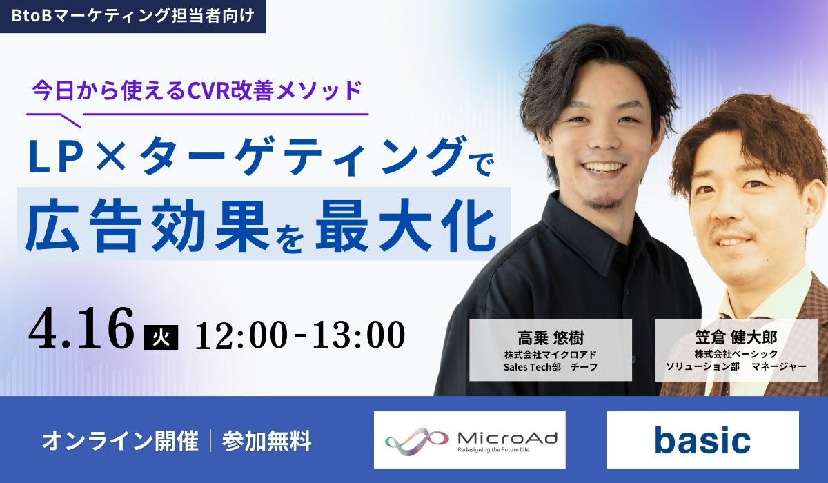 株式会社マイクロアド(本社:東京都渋谷区、代表取締役社長:渡辺健太郎、以下 マイクロアド)は、企業のBtoBマーケティング担当者に対し、株式会社ベーシックとともにオンラインセミナーを開催いたします。