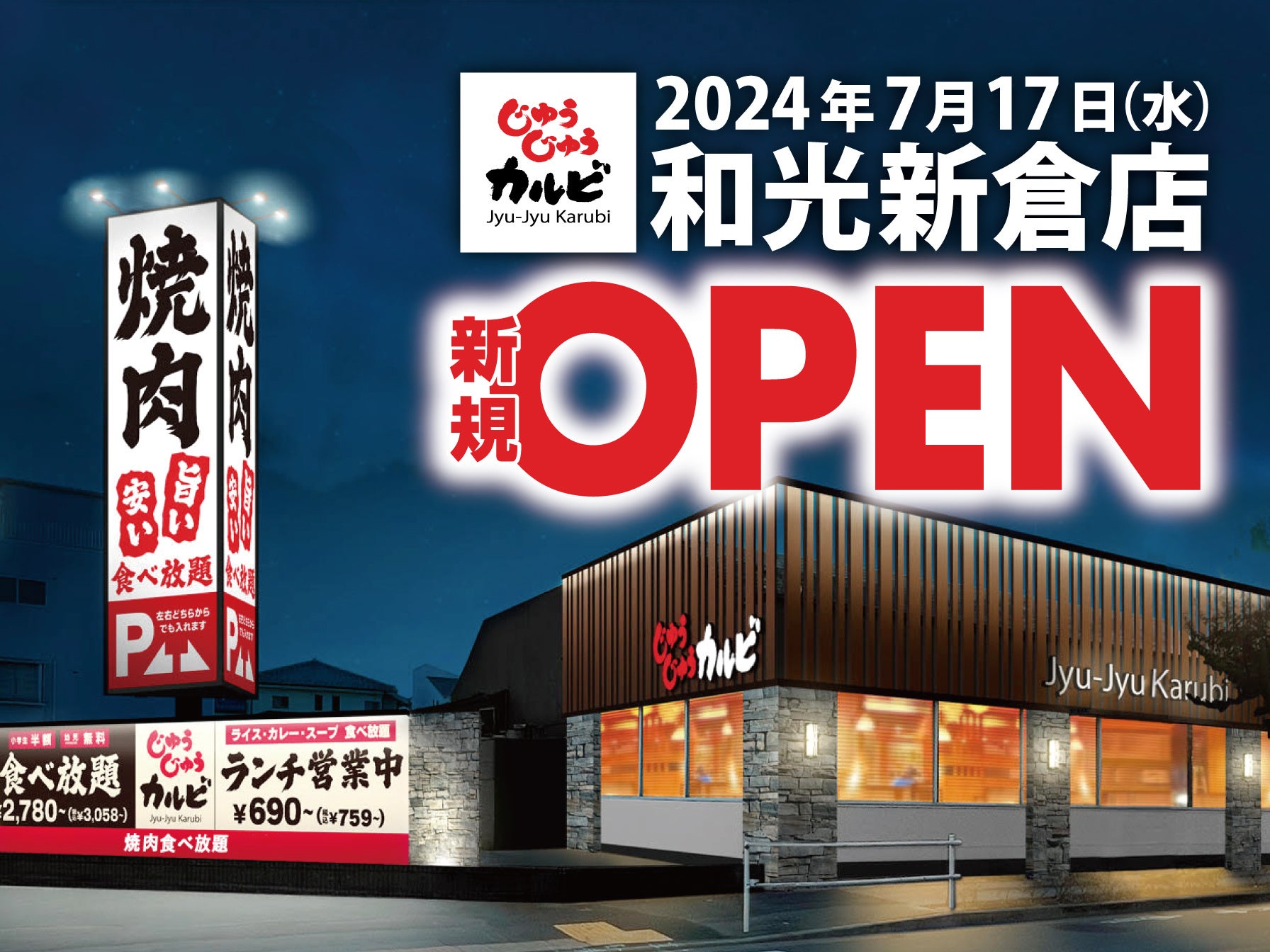 株式会社トマトアンドアソシエイツ(本社:兵庫県西宮市、代表取締役社長:小林 大二)が運営する焼肉食べ放題「じゅうじゅうカルビ」は、2024年7月17日(水)に「じゅうじゅうカルビ 和光新倉店」(埼玉県和光市)をオープンします。
