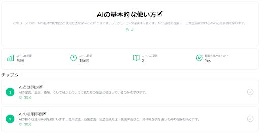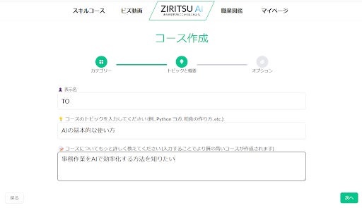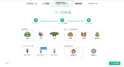 ユーザーが学びたいトピックのカテゴリーを選択し、具体的な内容や難易度、学習時間、チャプター数、動画の引用有無を入力するだけで、即座にカスタマイズされた学習コースを生成します。