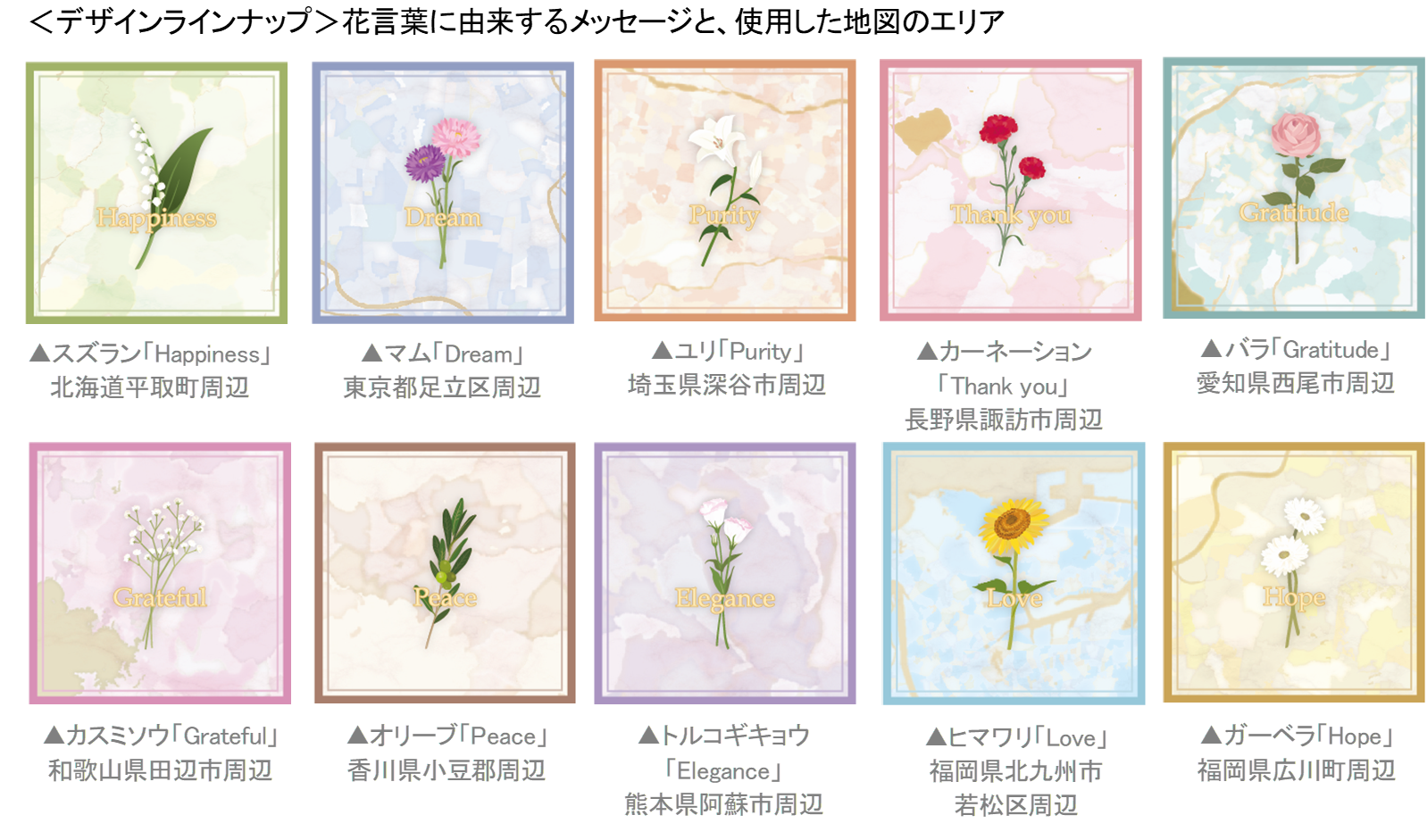 「街まち Bloom series」は、10種類のお花をモチーフにした、さりげない地図デザインのアイテムです。背景の大理石のようなマーブル模様は、ゼンリンの地図データをもとに、それぞれのお花の生産地など、ゆかりのあるエリアの地図を使用しています。“海や川、湖などの水域”や“町丁目界”、“大字界”などの区分を生かして、マーブル調にデザインし、花言葉に由来するメッセージを添えました。