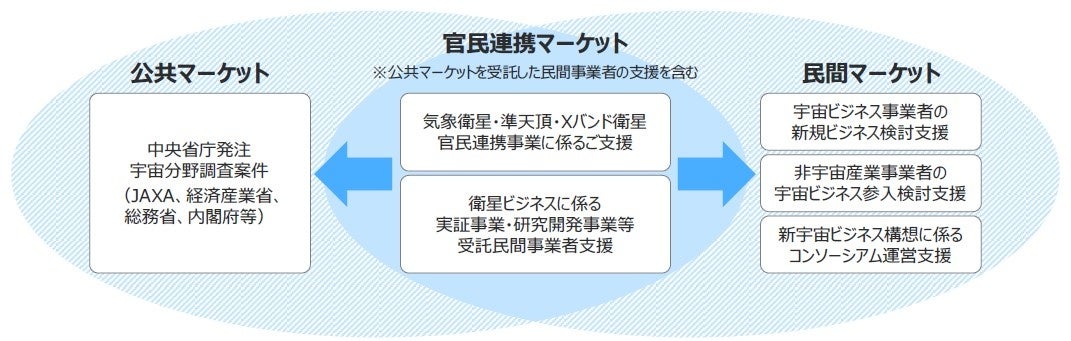 日本総研は、気象衛星や準天頂衛星に関する官民連携事業の支援をはじめ、官民連携マーケットから公共・民間双方のマーケットへアプローチし、調査案件、実証・研究開発事業支援、新規ビジネス創出の検討などさまざまな支援を行ってまいりました。