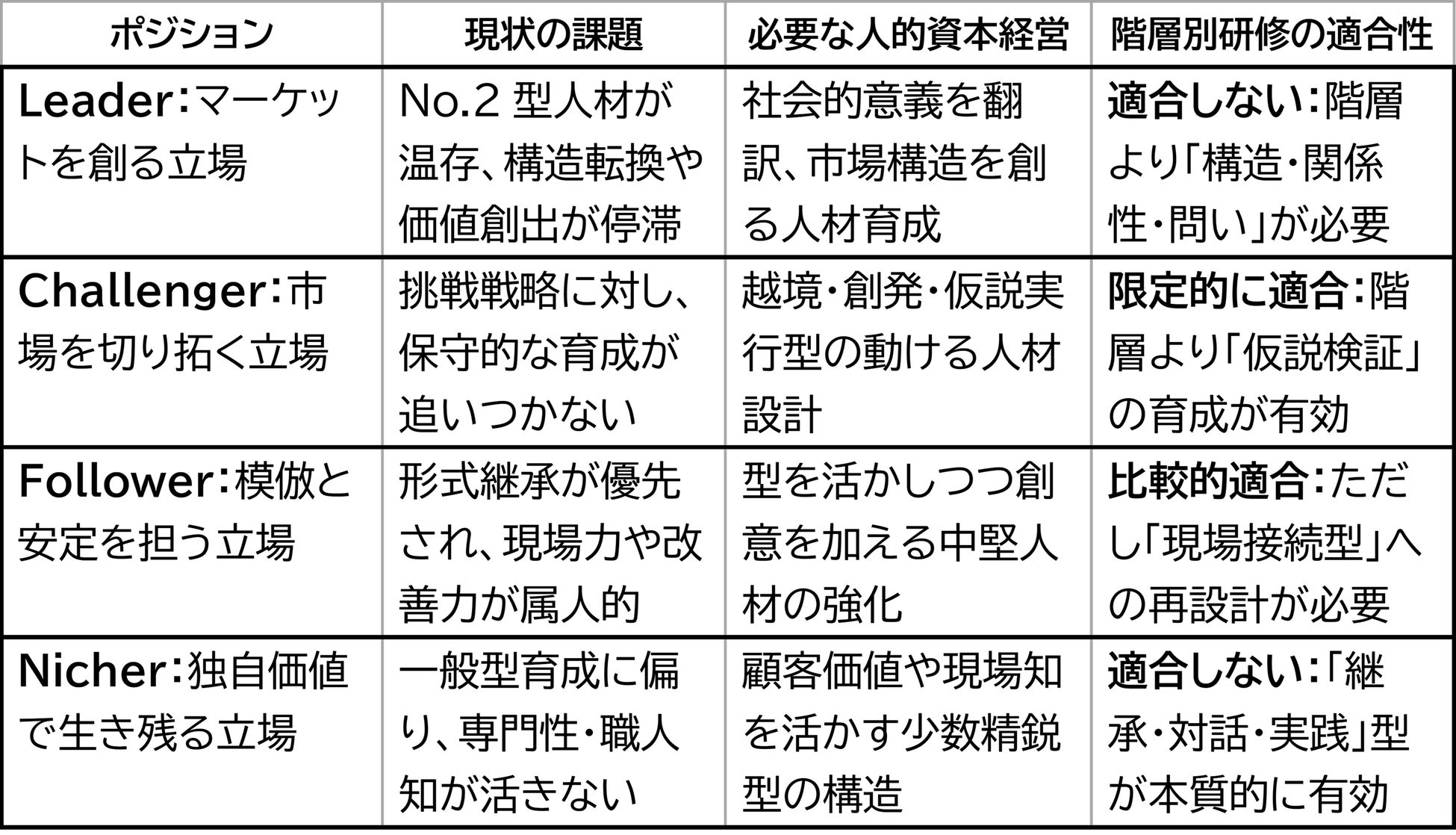 本モデルは、各企業が置かれている市場ポジション(Leader/Challenger/Follower/Nicher)に応じて、人材要件・育成構造を再定義する革新的な枠組みです。