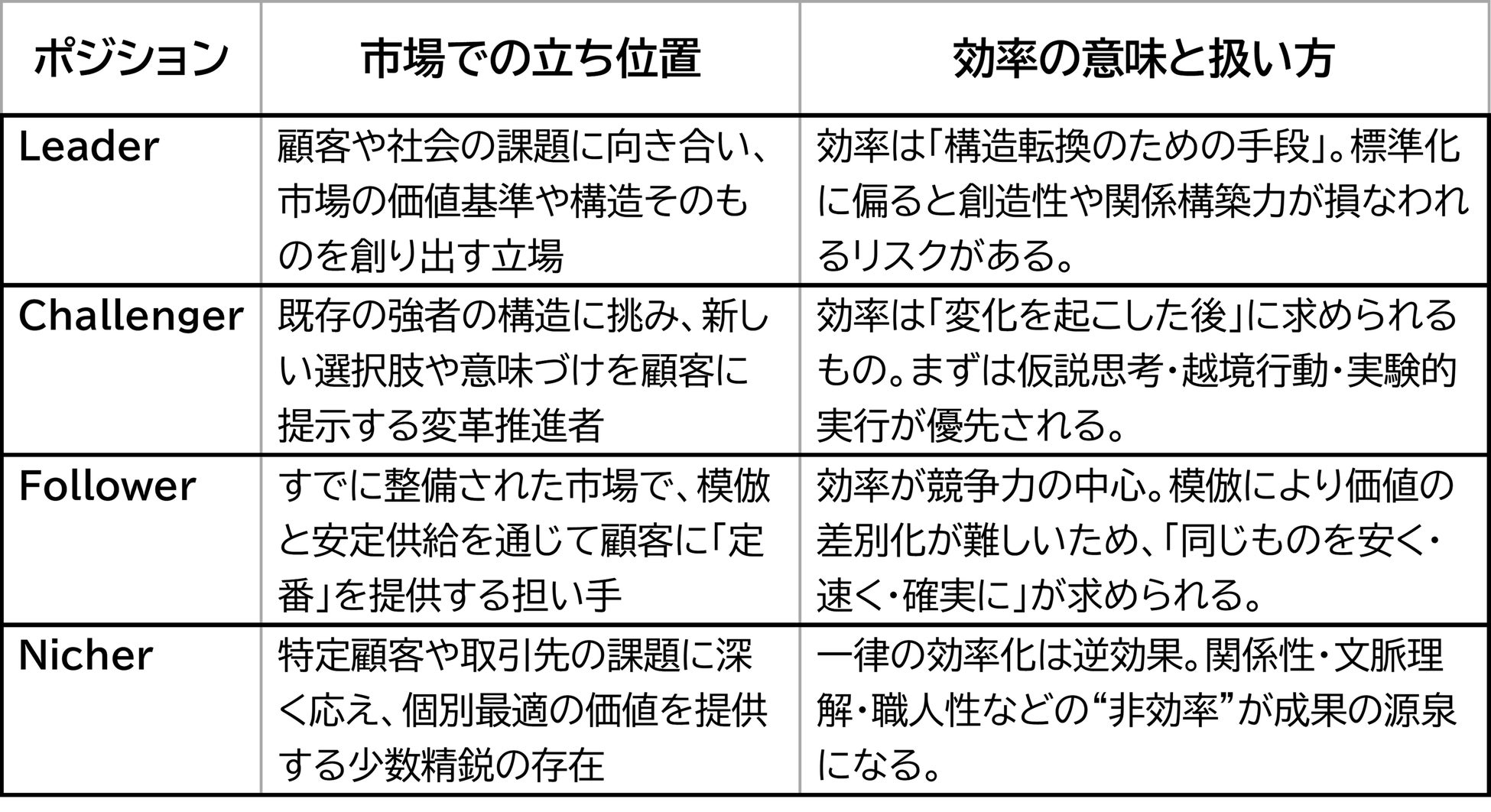 企業が置かれているポジション(Leader/Challenger/Follower/Nicher)によって、求められる“効率”の意味や人材要件は異なります。本モデルでは、それぞれにふさわしい育成構造を設計し、ズレを最小化します。