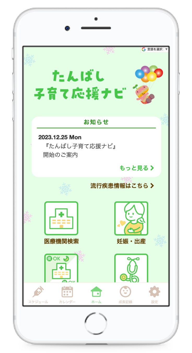 この度、妊娠期からの子育て期までの切れ目のない支援の一環として、子育て支援アプリ「たんばし子育て応援ナビ」の運用を開始しました。多言語翻訳機能やメール配信・プッシュ通知機能を有し、電子母子手帳機能や予防接種AIスケジューラー、子育て支援情報など、ICTを活用し安心して子育てできるよう支援します。ぜひ、ご活用ください。