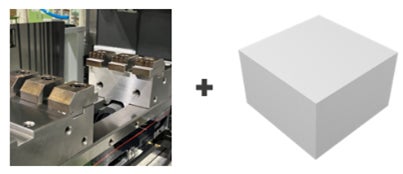 などを1つの装置に統合(パッケージ化)することで、加工ノウハウのデジタル資産化と切削加工時間の大幅短縮が可能となりました。また本装置は、ワーク素材にブロック材を使用し、治具を共通化することで、治具の交換や調整などの作業をなくし、段取りレス化を実現しています。