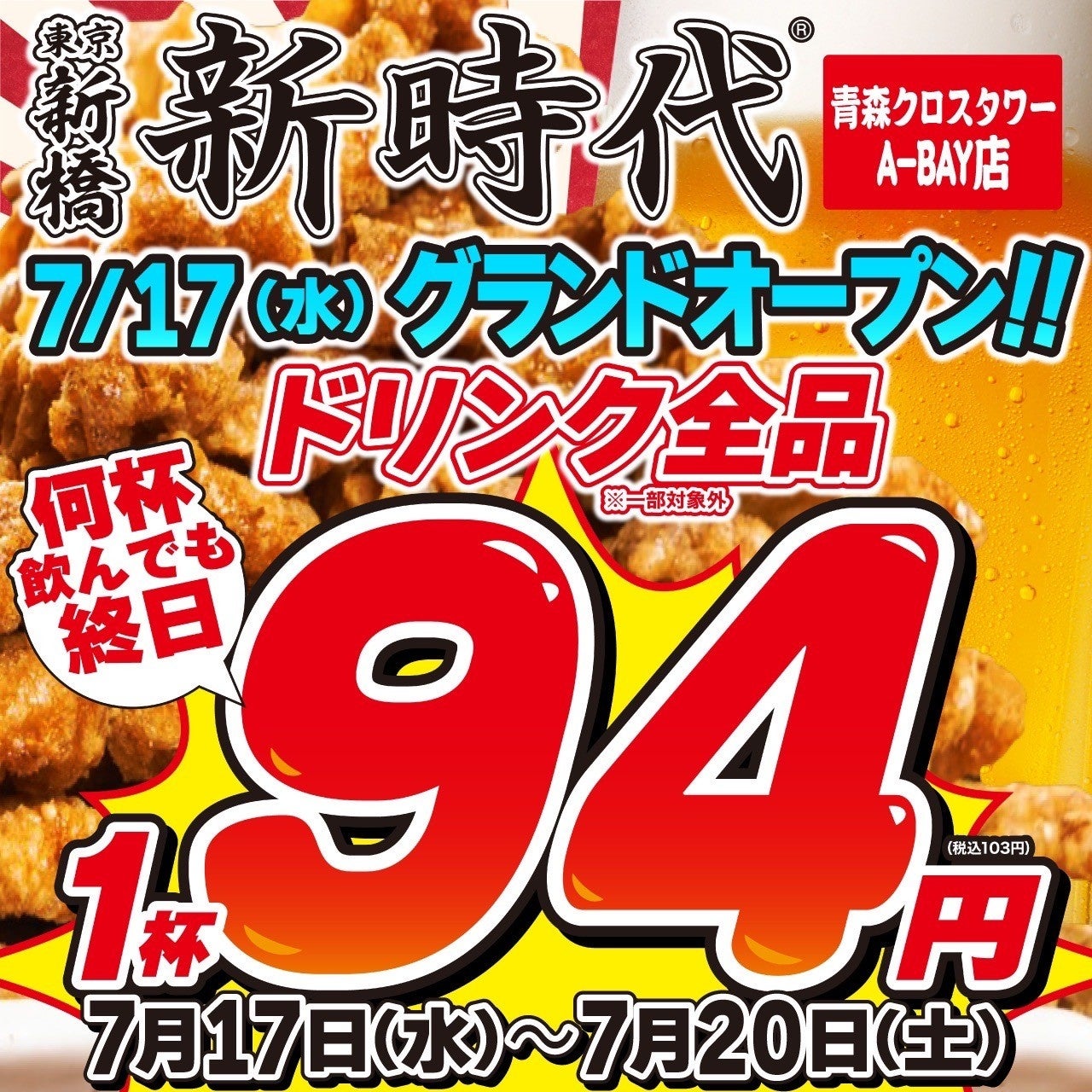「新時代 青森クロスタワーA-BAY店」のオープンを記念し、ドリンク全品94円(税別)キャンペーンを開催します。ぜひお越しください。