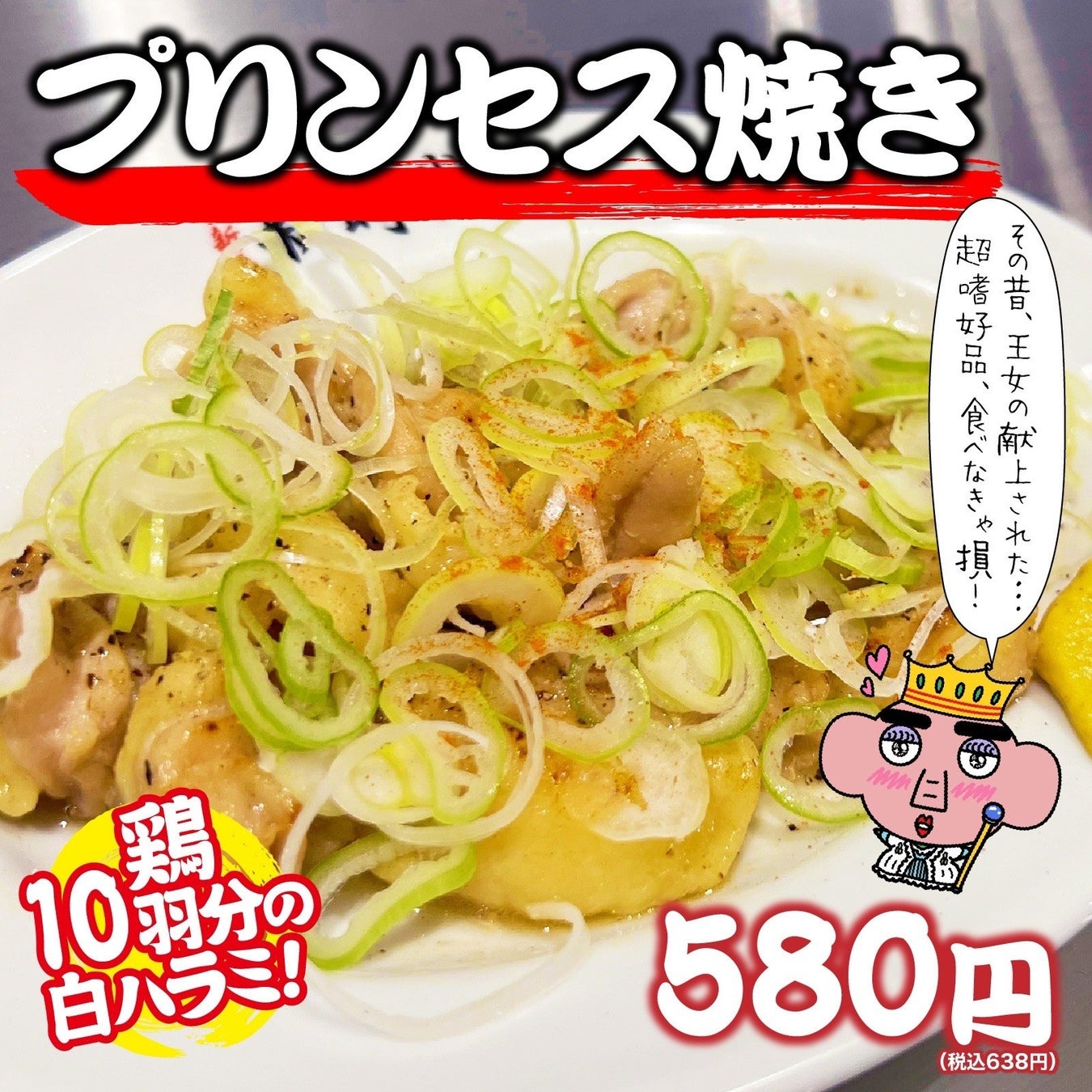 ・贅沢に鶏10羽分の白ハラミを使用『プリンセス焼き』580円