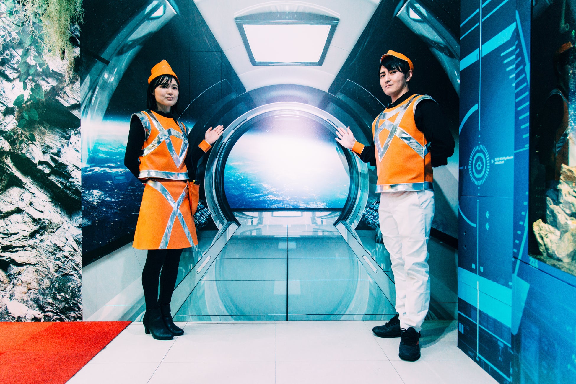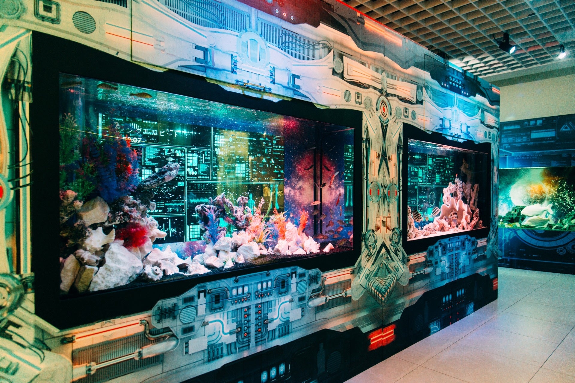 本施設は、“宇宙を旅するアクアリウム”をテーマにした没入型の展示で、来場者は“宇宙船の乗客”となり、出発から帰還までのプロセスを体験します。光・音・映像・香りと、生きた水生生物を組み合わせることで、フィクションと現実が重なる独特の臨場感を生み出します。