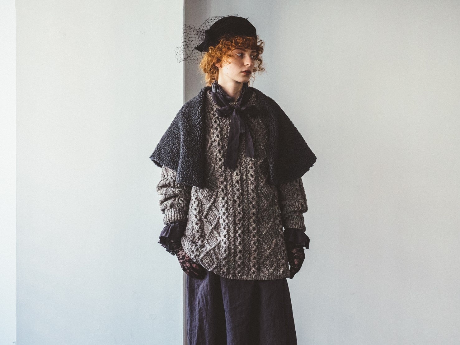 大きなケープのような付け襟は、巻き方次第でがらりと印象を変えられる。