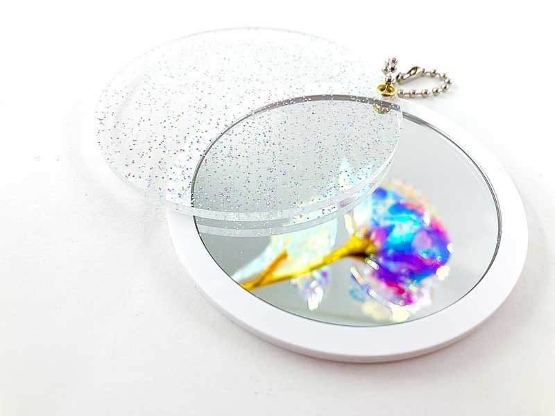 アクリルでミラーを挟む仕様となり、アクリルをスライドする事でミラーが出現致します。接合部分の穴にボールチェーン(無料)を通せばキーホルダーにもなります。